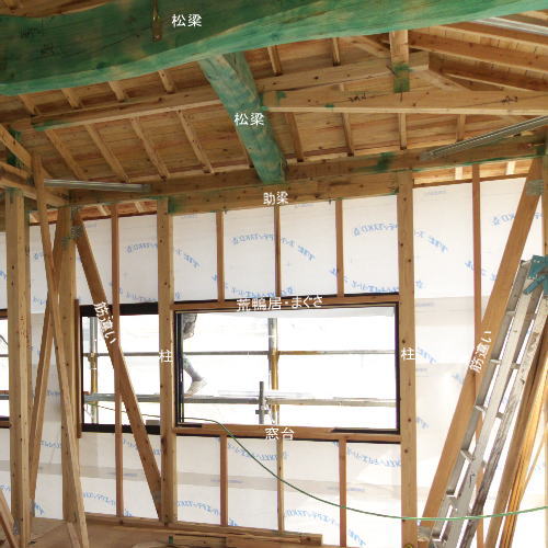 筋違い(すじかい) 地震や台風などの横揺れに対する斜めの構造部材。